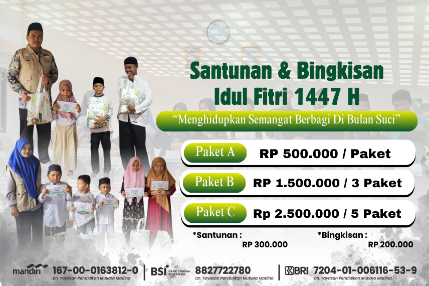 Santunan dan Bingkisan Lebaran 1447 H hadir untuk menguatkan yatim dan dhuafa menyambut hari raya. Setiap titipan yang diberikan menjadi pelipur hati, penumbuh harapan, serta amal jariyah yang insyaAllah terus mengalir.